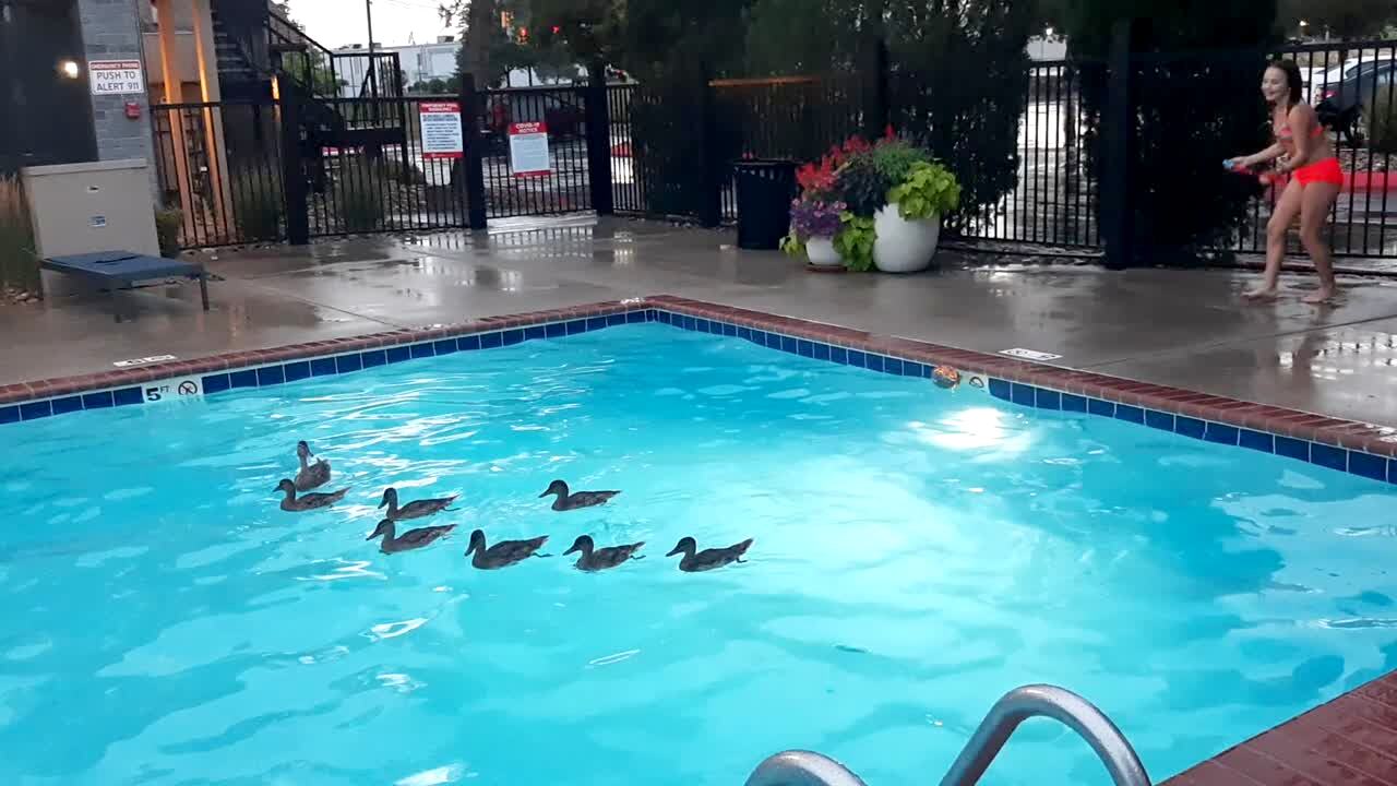 A teen boy and a teen girl throw a ball back and forth across a swimming pool full of ducks. The duck birds swim back and forth with the direction of the ball.