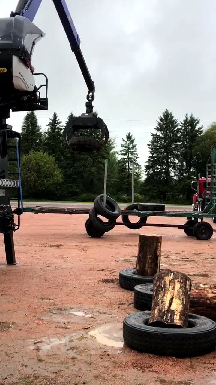 A man in a hydraulic loader in a field uses the loader to toss a tire like it was a game of ring toss and it lands on a pole.