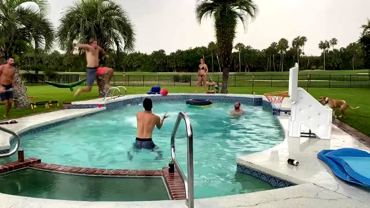 A group of teen boys do a basketball trick shot where one boy throws it across the yard to other boys at a pool who catch it and pass it to each other and the last boy shoots it into the hoop in slow motion.