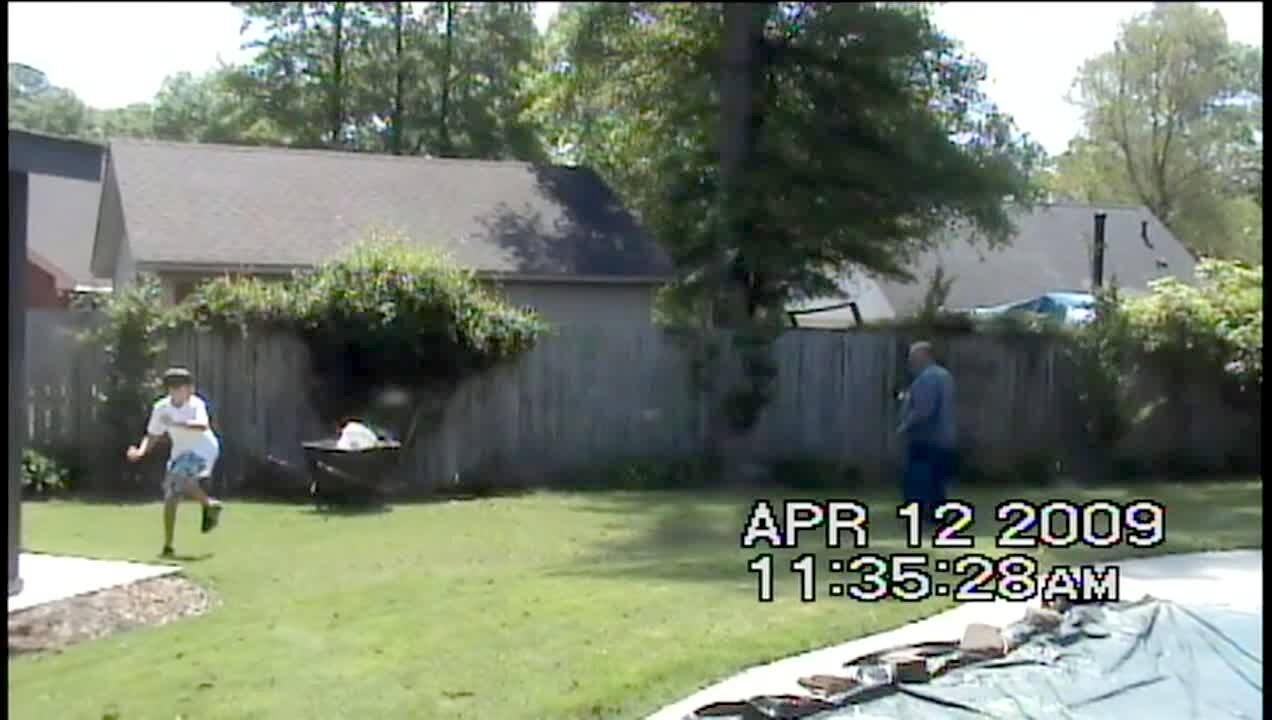A young girl hits a wiffleball that hits her father in the head while he sits in a lawn chair in the yard. It ricochets off his head and flies offscreen.
