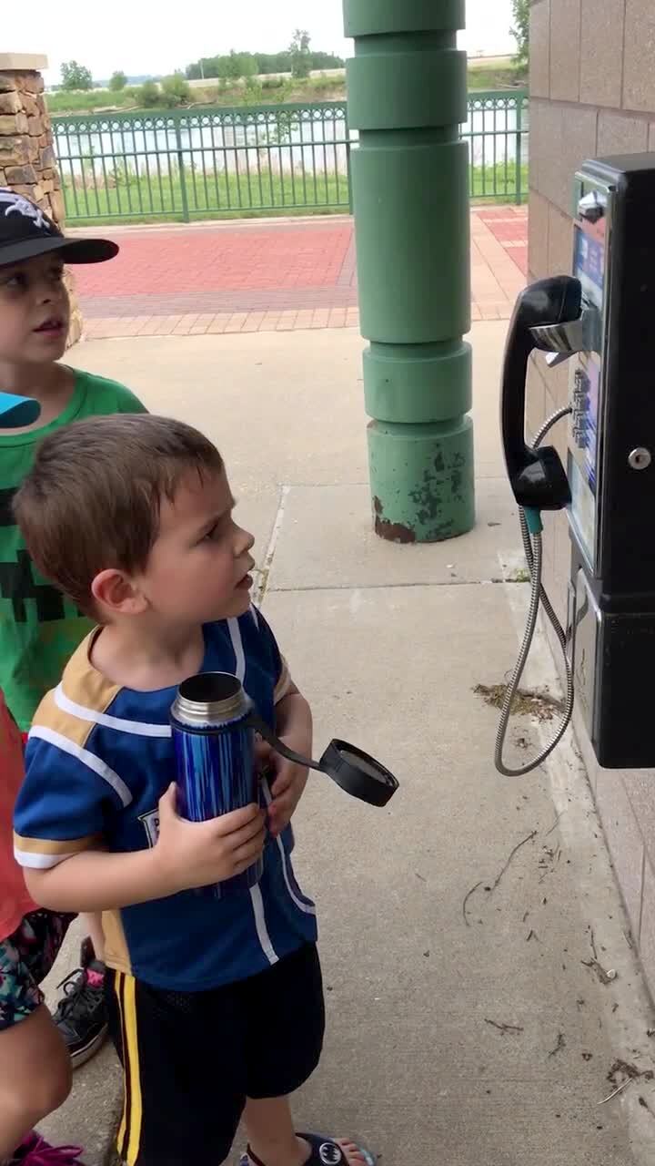 Two young boys and two young girls stand next to a pay phone at a playground park and a woman asks them if they know what it is.
