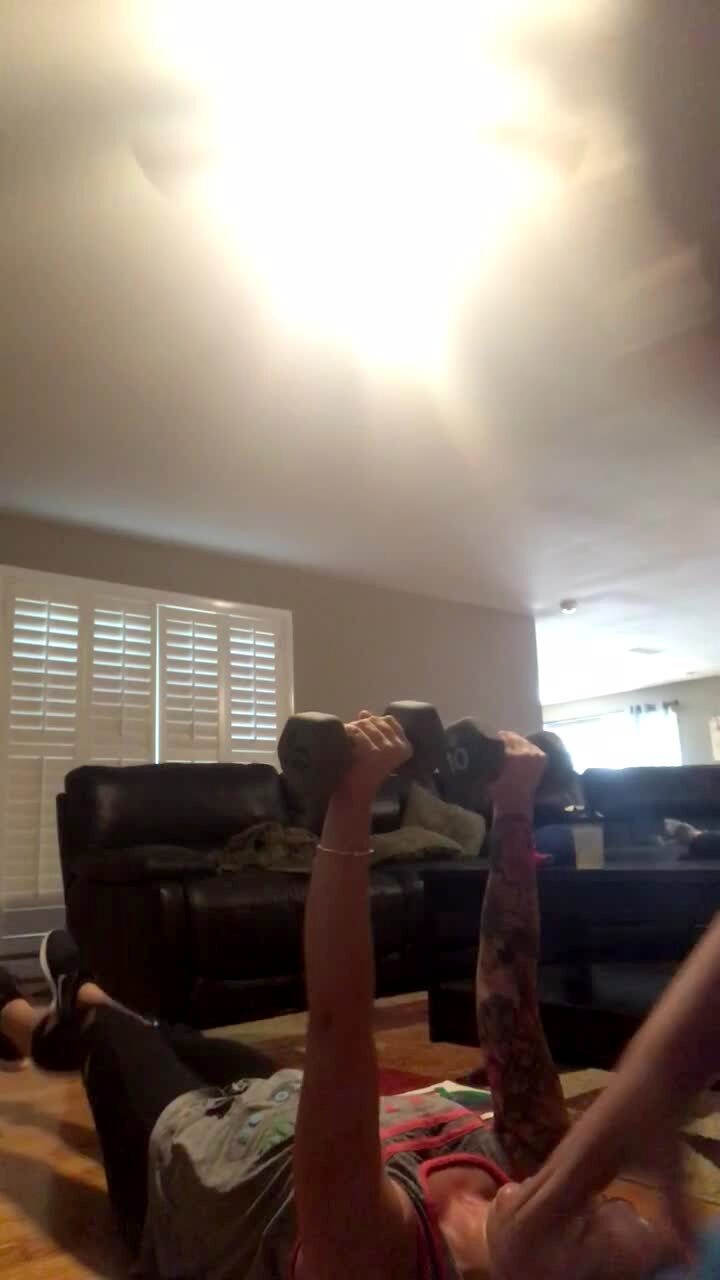 A young boy shakes his butt in front of the camera while his mother films herself while she works out in the living room.
