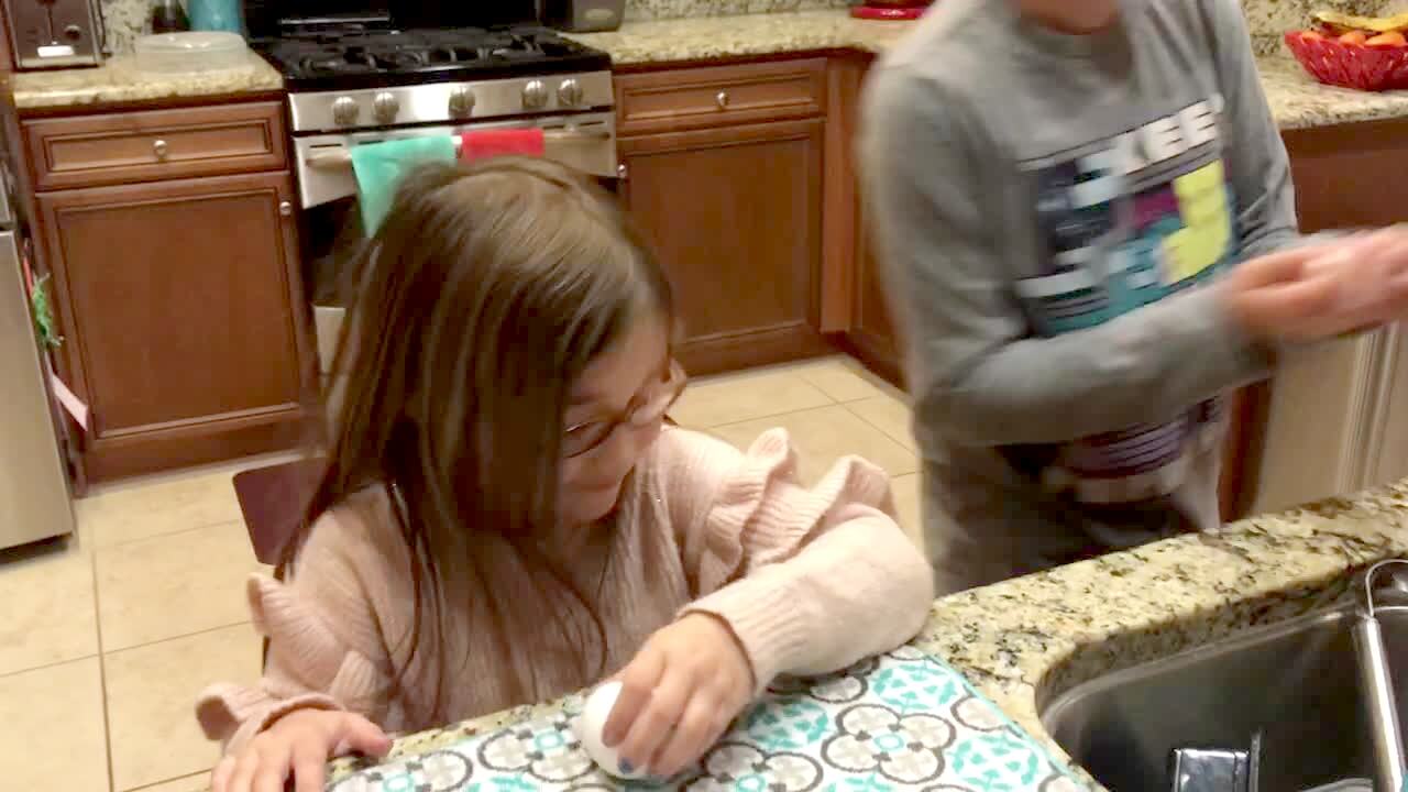 A young boy cracks an empty egg on his head in the kitchen before his young sister screams when she copies him with a real egg and gets yolk in her hair.