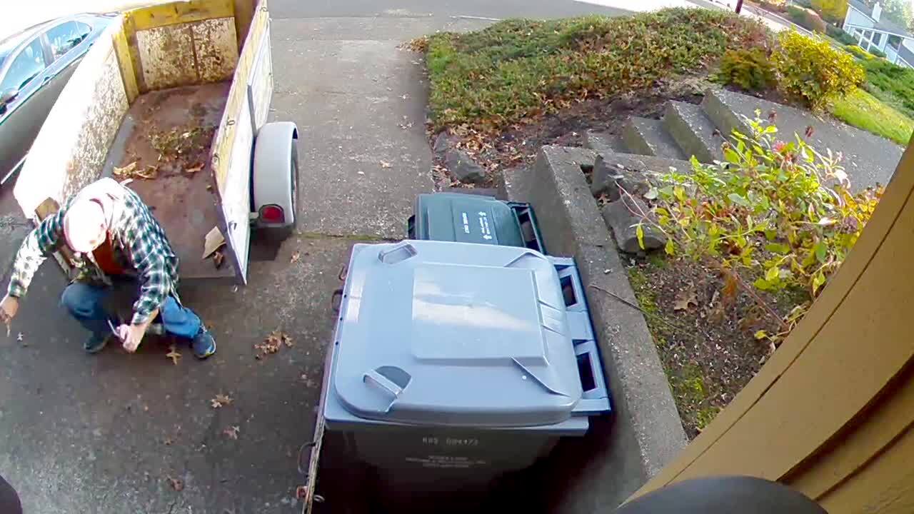A security camera captures a man walk backwards with a wheelbarrow and fall into a pool in a backyard.