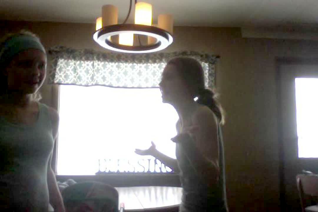Two teen girls lip sync along with hip hop music & stand on chairs. One girl falls forward and down to the floor hard.