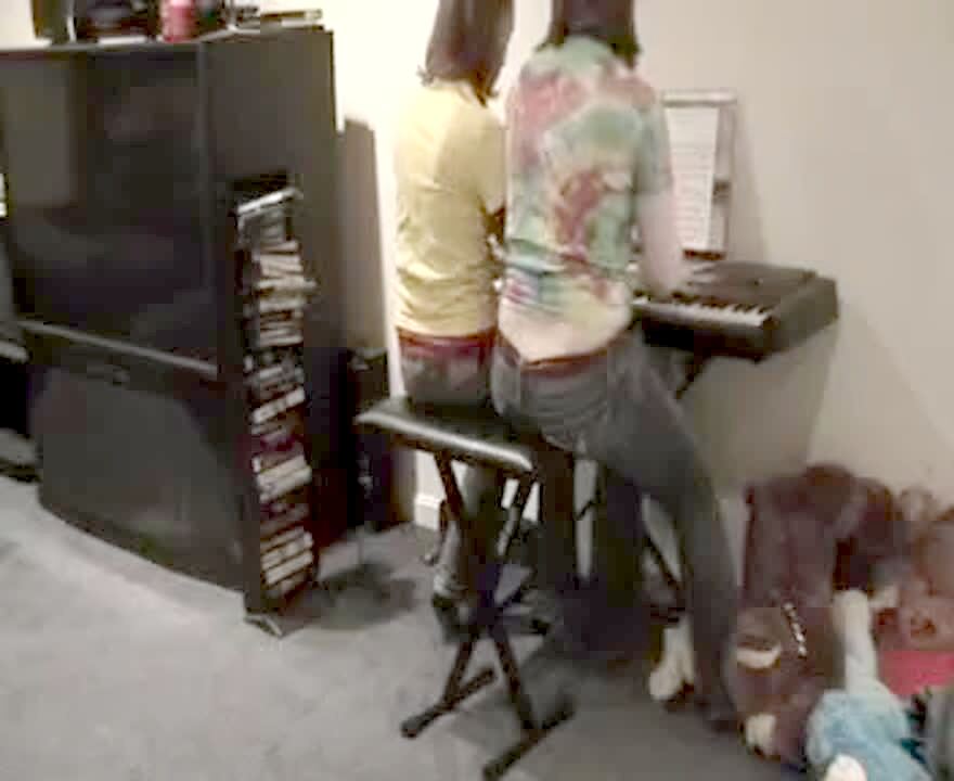 Two teen girls play a song on keyboard. They mess up. One girl gets up frustrated and the other falls off the piano bench into video tapes.