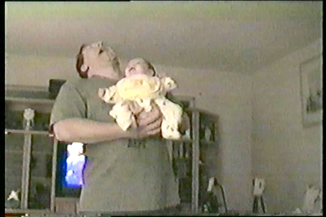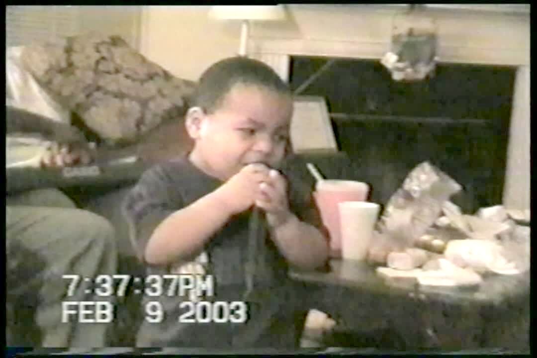 A series of clips where a man lip syncs while a tot boy yells and talks nonsense in the living room.