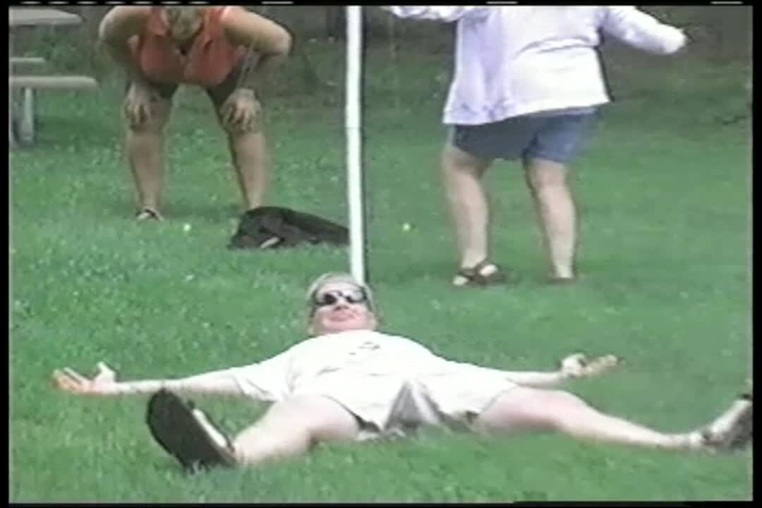 Man gets hit in the face by a volleyball at family picnic.
