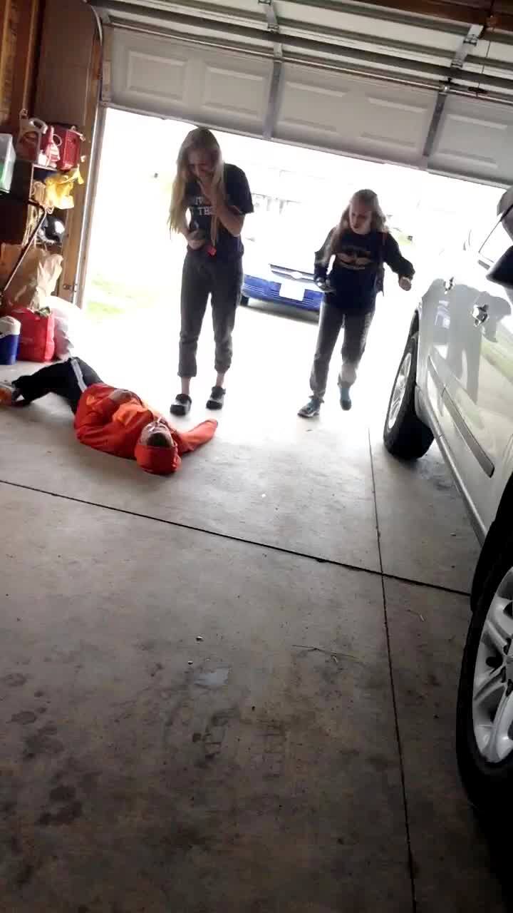 "Pencil Nose Prank" - A young boy lays on the floor of a garage with makeup to look like a pencil stabbed into the boy's head. Two teen girls enter the garage and find the boy on the floor and call for him to get up. The boy stands up and all three go inside where one of the girls cries to their mother about how scared she was while the second sister laughs.