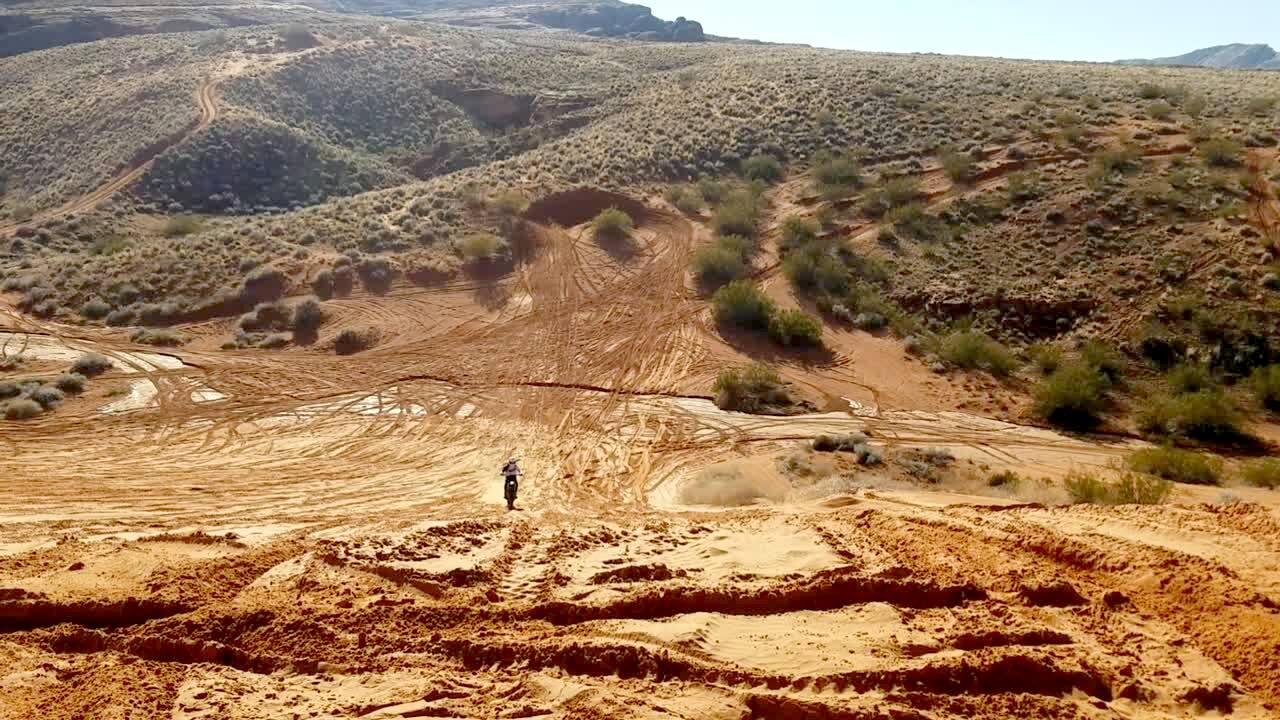 A man rides a kids stroller down a large hill, and his feet catch at the bottom and he flings into the air and faceplants.