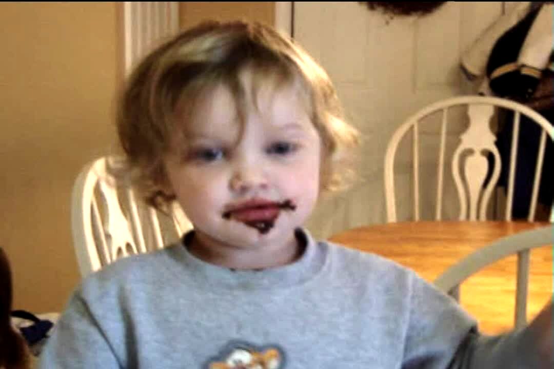 A tot boy plays with kinetic sand at a small table while his mother sneaks up behind him with the camera, then she yells "What are you doing" and he screams.