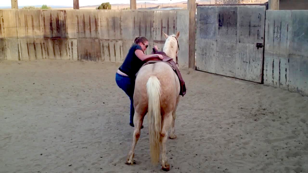 Woman tries to mount horse by climbing its neck. Horse picks up woman and flips her on his back, she falls off. *tracking off
