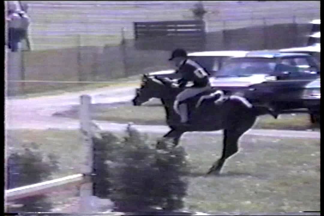 Senior woman on horse tries to dismount onto man's shoulders. They both fall down. . "That was what you call a rough dismount."