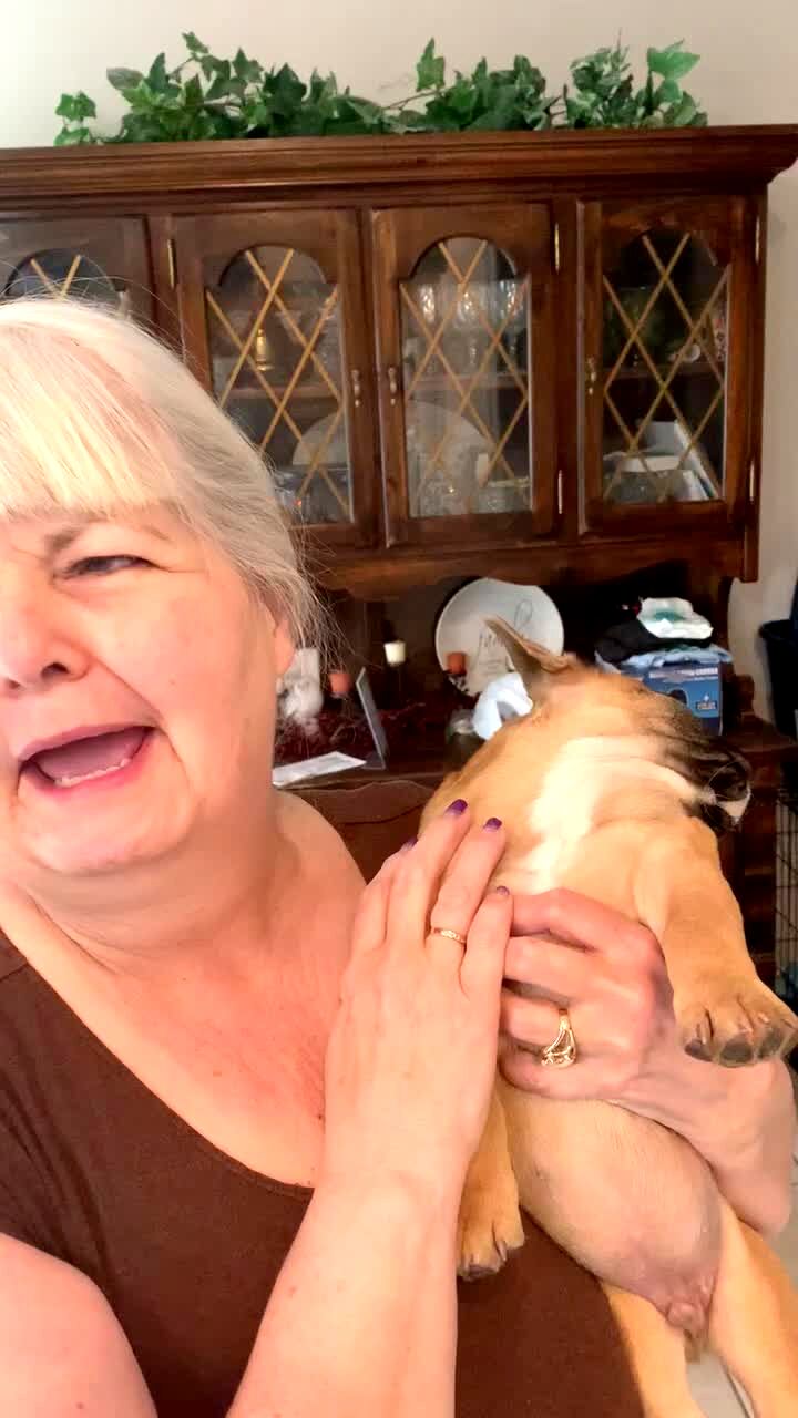 A senior woman twirls a baton in her yard, walks over to the camera to turn it off, then trips and falls and knocks the camera over.