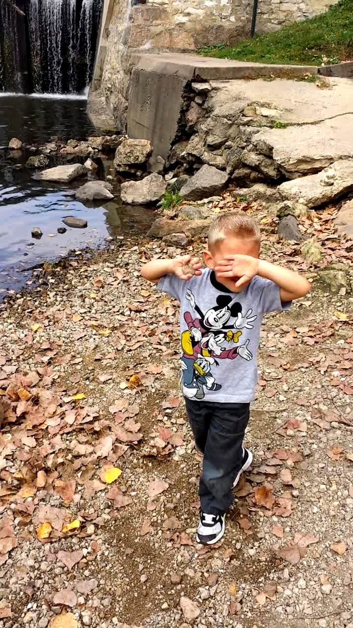 A young boy throws a rock to skip it in a river outdoors but it hits his mom's camera.