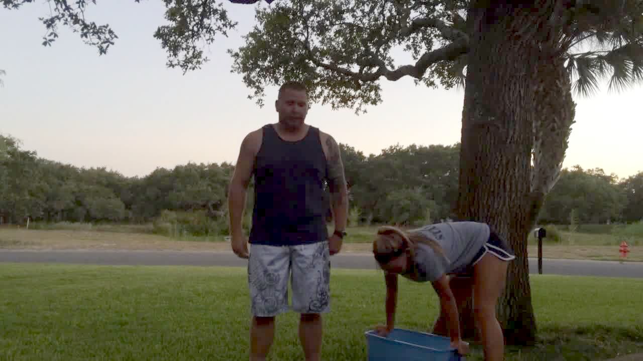 A senior woman instructs a young boy to throw a bucket of water on a piece of paper stuck to the sidewalk and instead of pouring the water out he throws the whole bucket.
