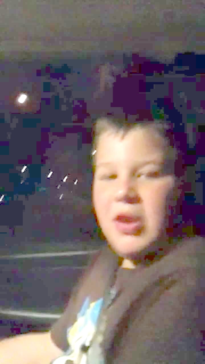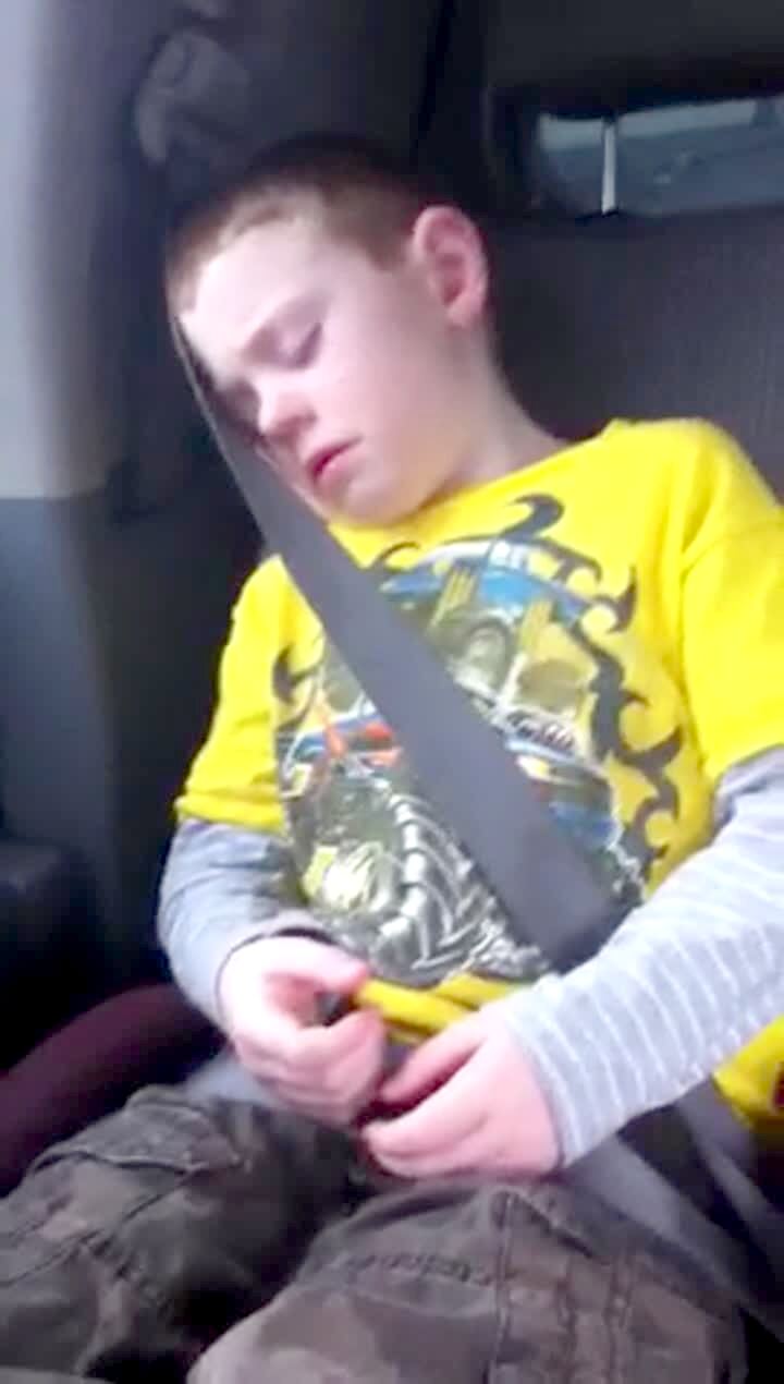 Young boy sleeps in the backseat of a car. Man off camera yells "Dogs dogs dogs!" Boy wakes up with a great scared face. Family laughs, boy says "You're mean." Sideways camera. Practical joke.