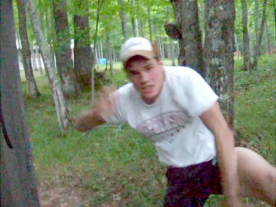 Teen boy sneaks up on another teen boy & scares him while they're in the woods. Teen jumps back and falls when he gets startled. Practical joke, surprise. Set up.