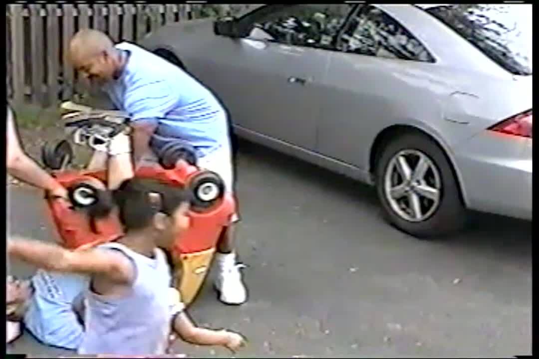 Teen boy is stuck inside toy car. He lays on the ground & 2 men try to pull car off his legs. Teen gets out on his own. Bonehead.