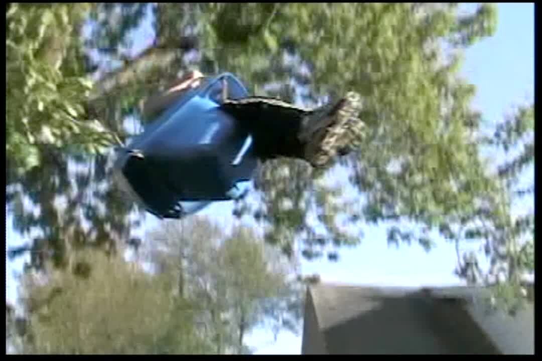 Dad pushes tot boy really high on tree swing, the rope breaks and boy goes upside down. Mom behind camera screams, man has caught son and he's ok.