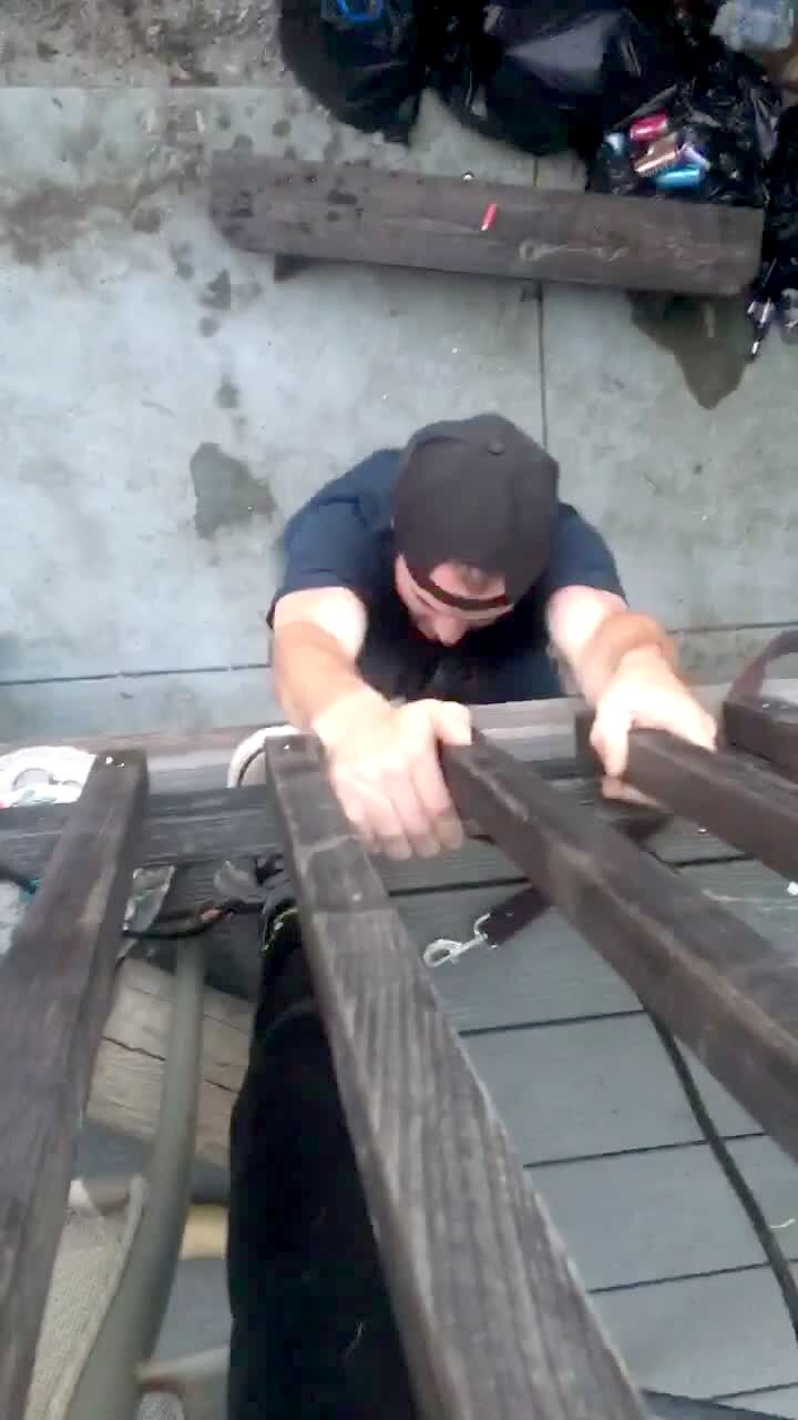 A teen boy falls onto a couple of garbage bags after he tries to climb up onto a balcony and the wooden rails he had a grip on break loose.