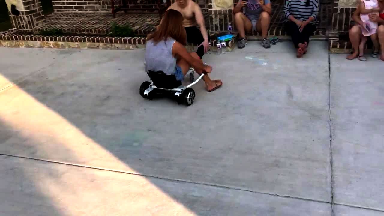 A woman falls on the front lawn after she rides a motorized scooter toy around her driveway.