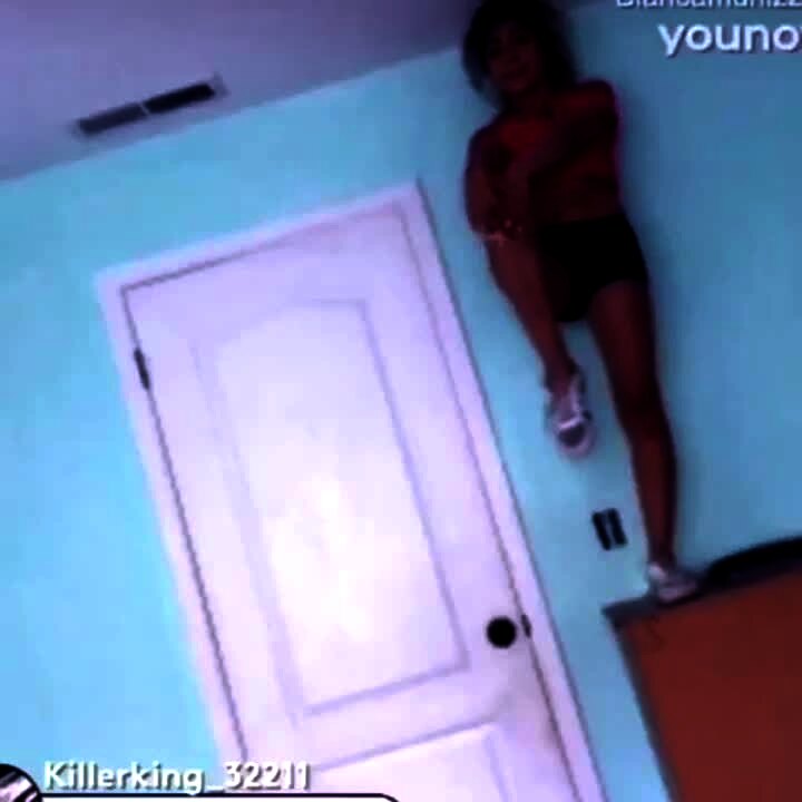 A teen girl falls after the dresser she stands on tips over while she practices a cheer-leading routine.