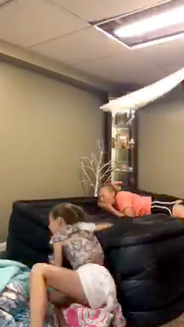 A light cover falls from the ceiling after a teen girl jumps on an air mattress and bounces a young girl in to the ceiling.