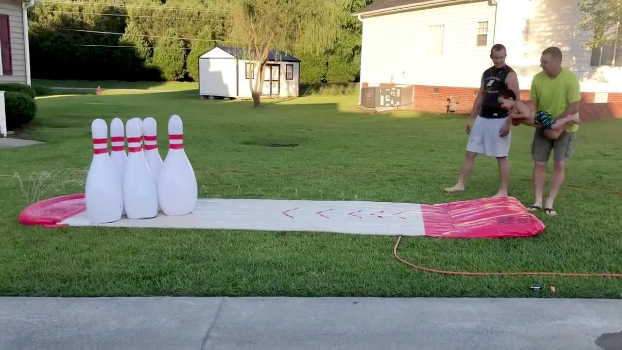 A tot boy doesn't slide on a slip and slide when there isn't enough water on it as his father throws him at a group of plastic bowling pins.