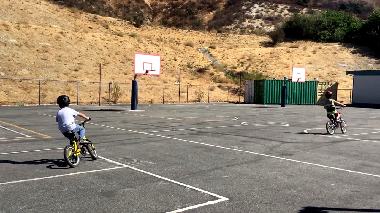 A young boy falls on the ground at a playground park at a school when he hits the curb with his bicycle as he rides it around the basketball courts.