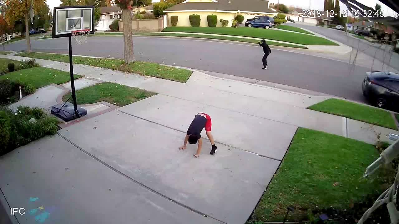 A teen boy tries to throw a basketball at his young boy brother's butt, but hits him in the head. Video from home security camera, no audio.