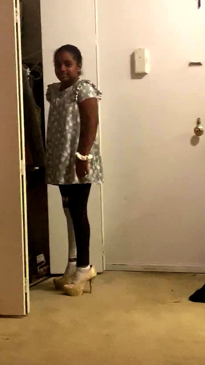 A young girl loses her balance and falls while she wears high heel shoes in a living room.