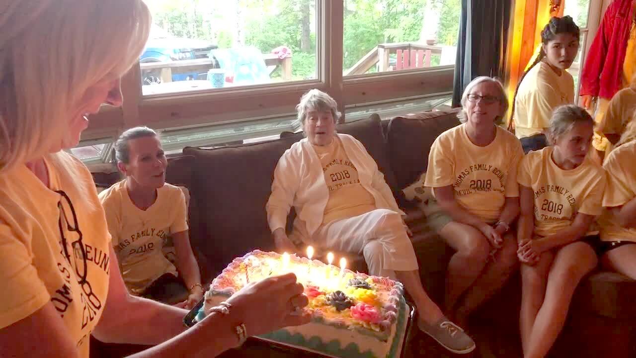A woman curses in the living room when she drop a birthday cake on to a woman's lap as she goes to blow out the candles.