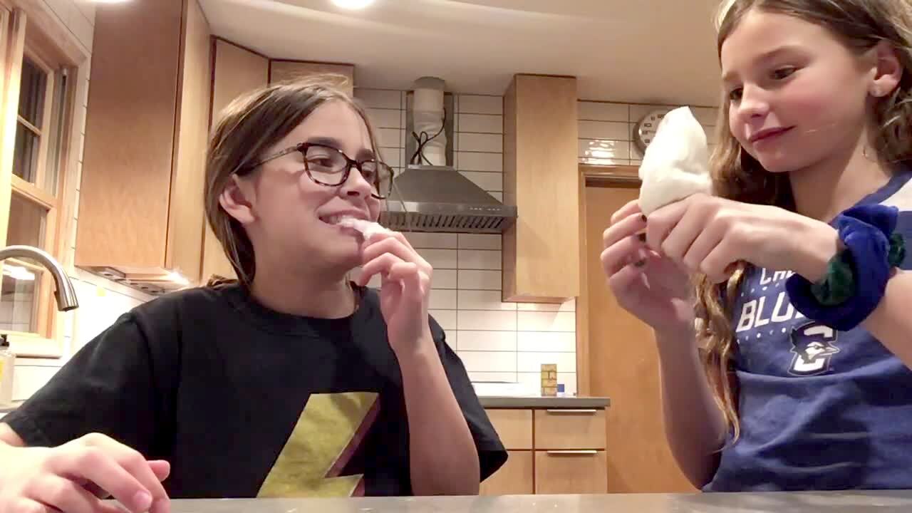 Two young girls eat whipped cream out of plastic wrap in the kitchen. When one girl squeezes her whipped cream, it sprays into the other girl's face.