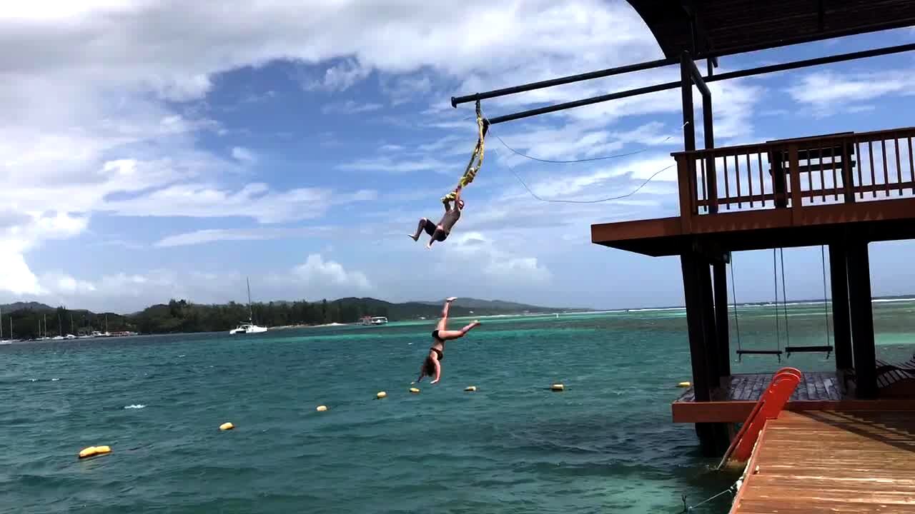 A woman flips backwards in to the water at the beach after she jumps off of a raised pier and grabs a rope, then loses her grip.