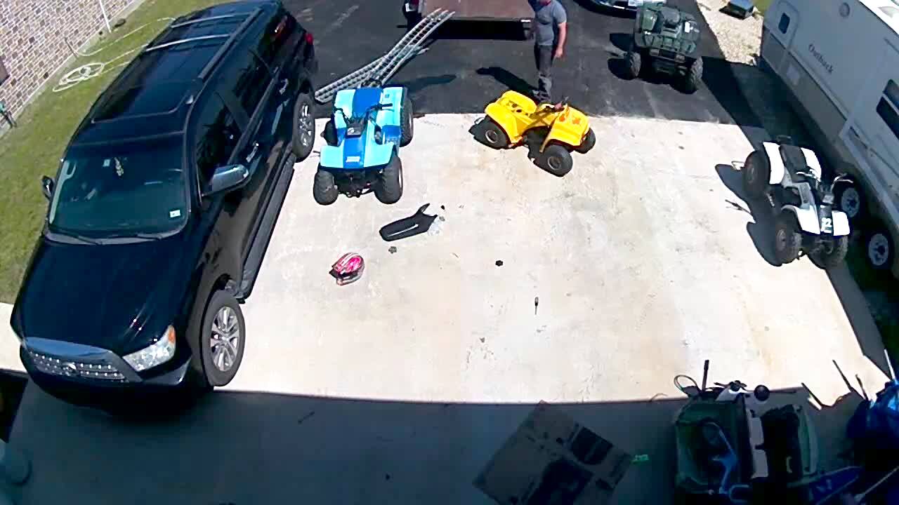 A man tries to load a four wheeler onto a trailer, and it flips over and drags him on the driveway. Security footage.