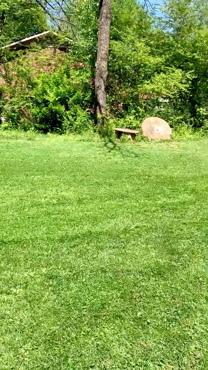A man drives a lawnmower in the backyard, and bumps into a wall. He steps out of the lawn mower, then it continues to drive away as he chases after it. Home security footage.