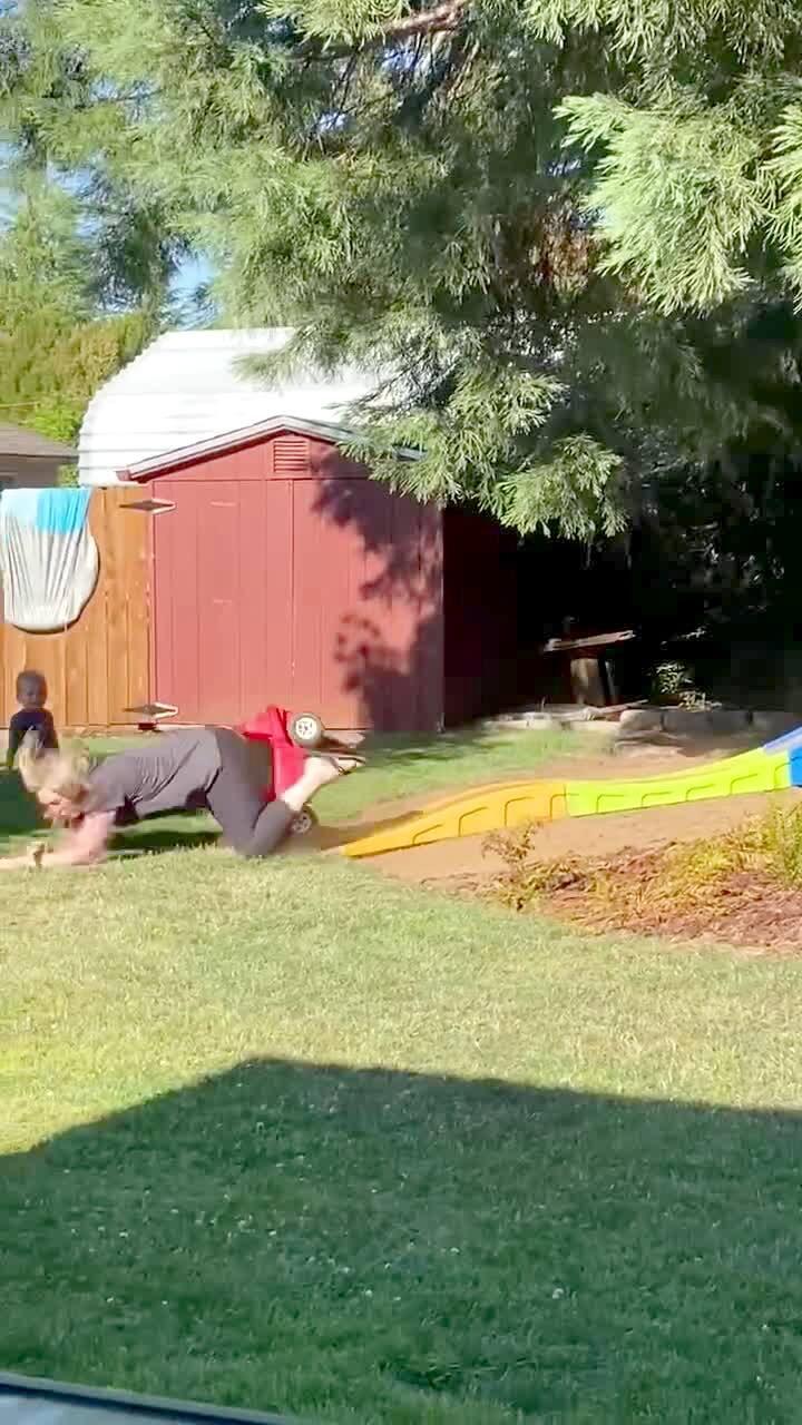 A woman rides down a toy rollercoaster track and falls forward on her face in a yard.