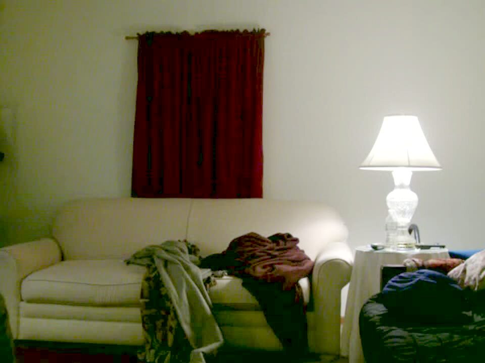 2 friends scare roommate by having her sit on couch as man with scary mask bursts through the window behind them. Good reaction.