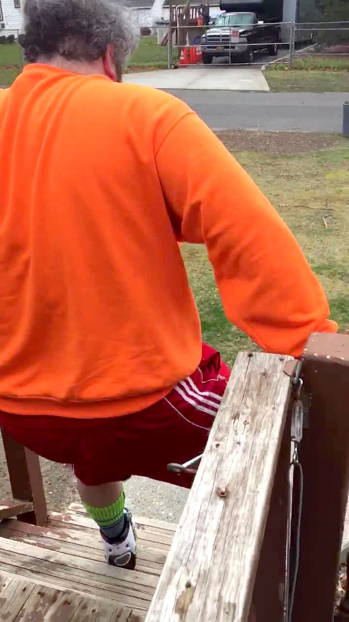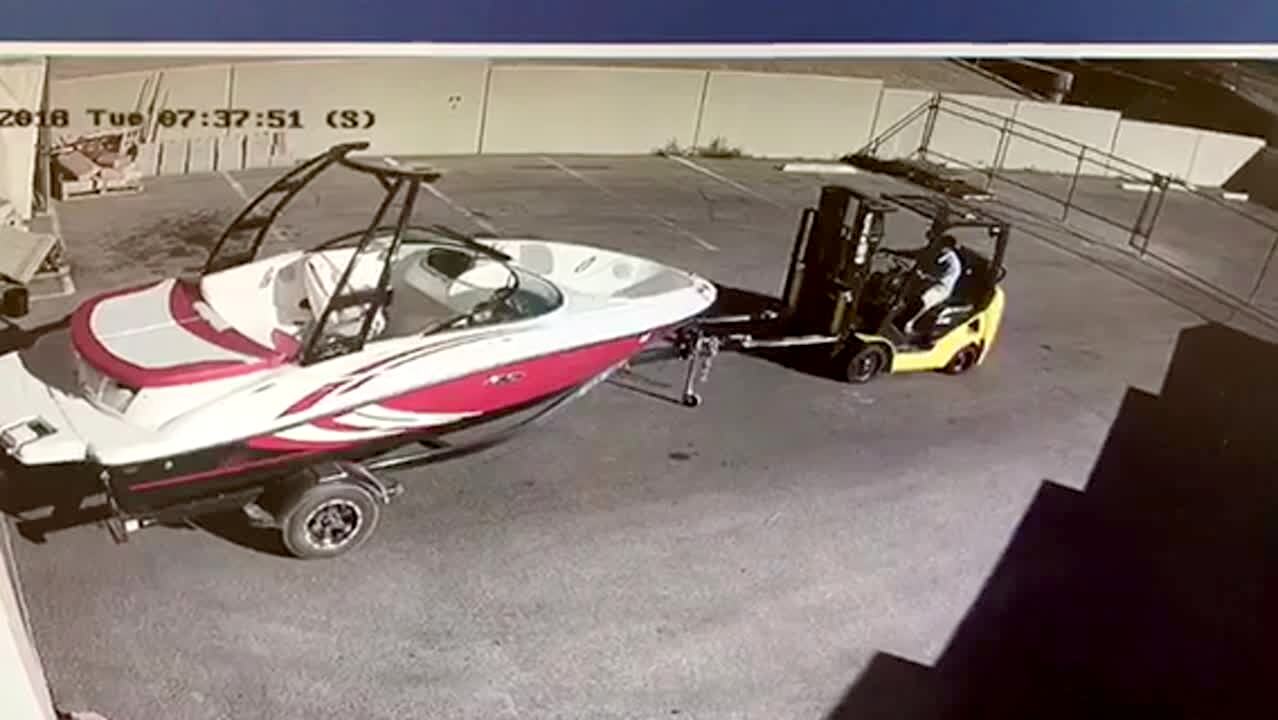 A man uses a forklift to move a boat across a parking lot, but the boat slips from the fork and rolls down the hill. The man gets out of the forklift and runs to stop the boat, but forgets to turn on the brakes for the forklift, so it rolls down the hill as well and hits the boat. The boat turns and goes farther down the hill and hits a fence. The man runs to get the boat and the forklift comes back down the hill and hits the boat again. Submitter contacted to re-submit