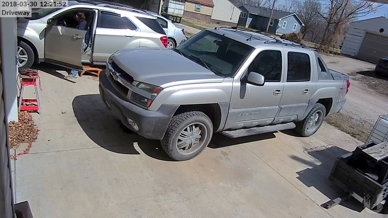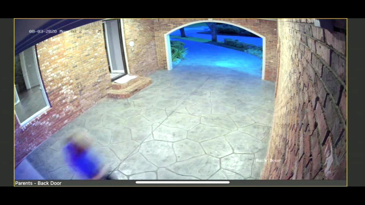 A woman gets out of car in the garage. The car is still in neutral and rolls down the hill. The next two clips show the car continue out of the driveway and into a park from different camera angles. There is a voiceover of a man laughing. Security camera screen recording