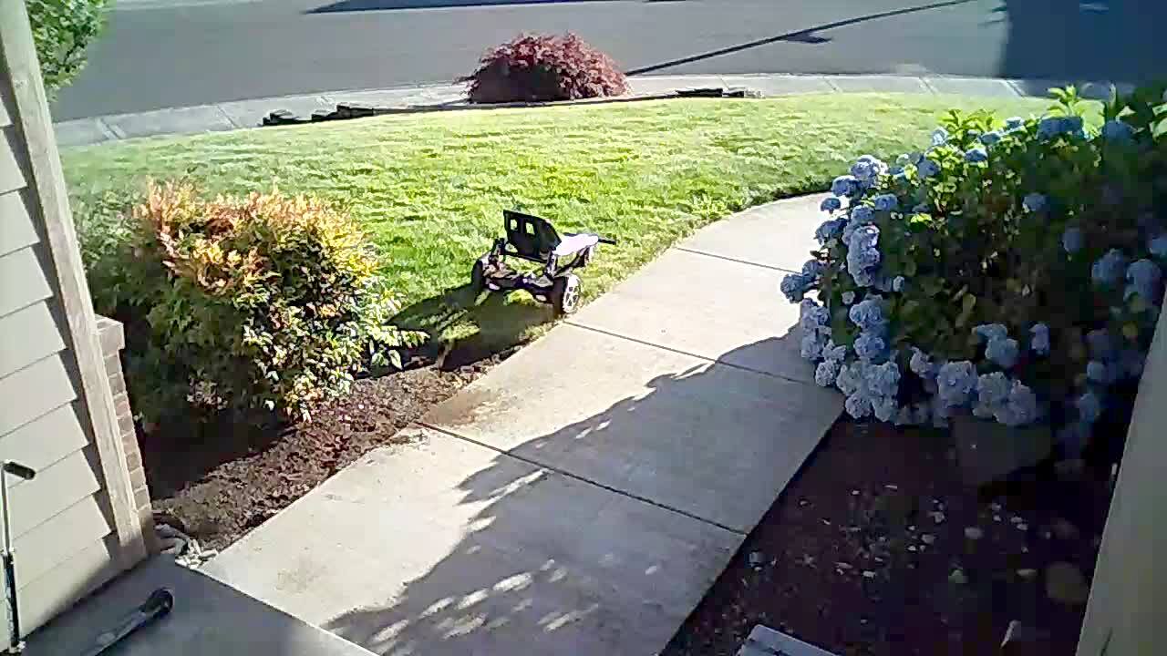 A girl turns on a go-cart in the yard and it starts to spin around and hits her and she trips over it and falls. Home security footage. No audio