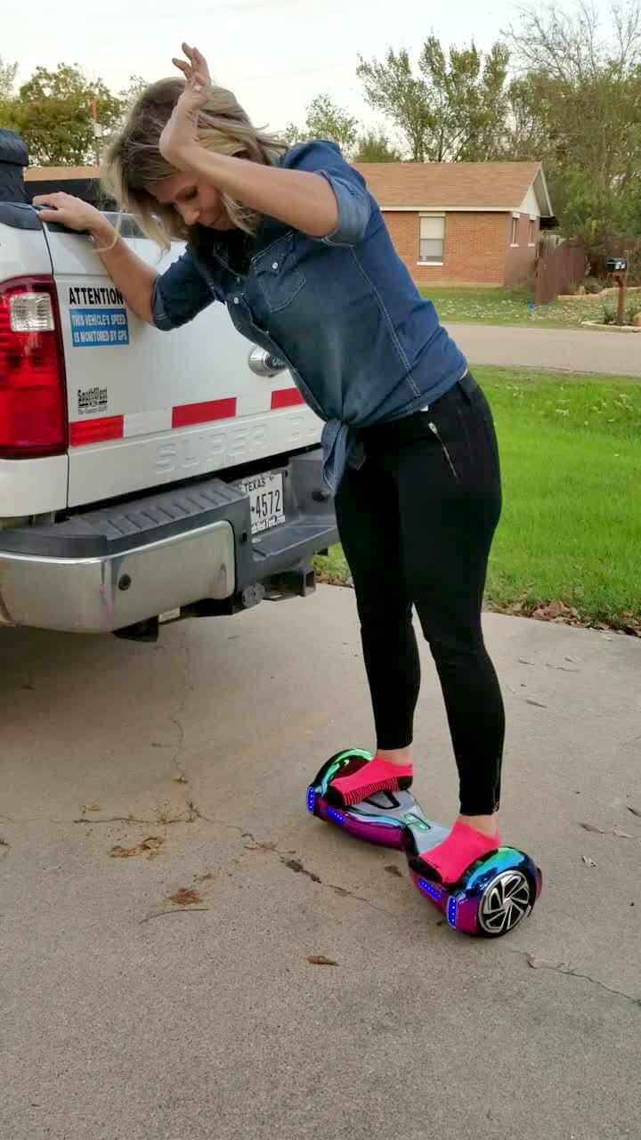 A woman tries to ride a hoverboard in driveway as she holds on to a truck and she falls down.