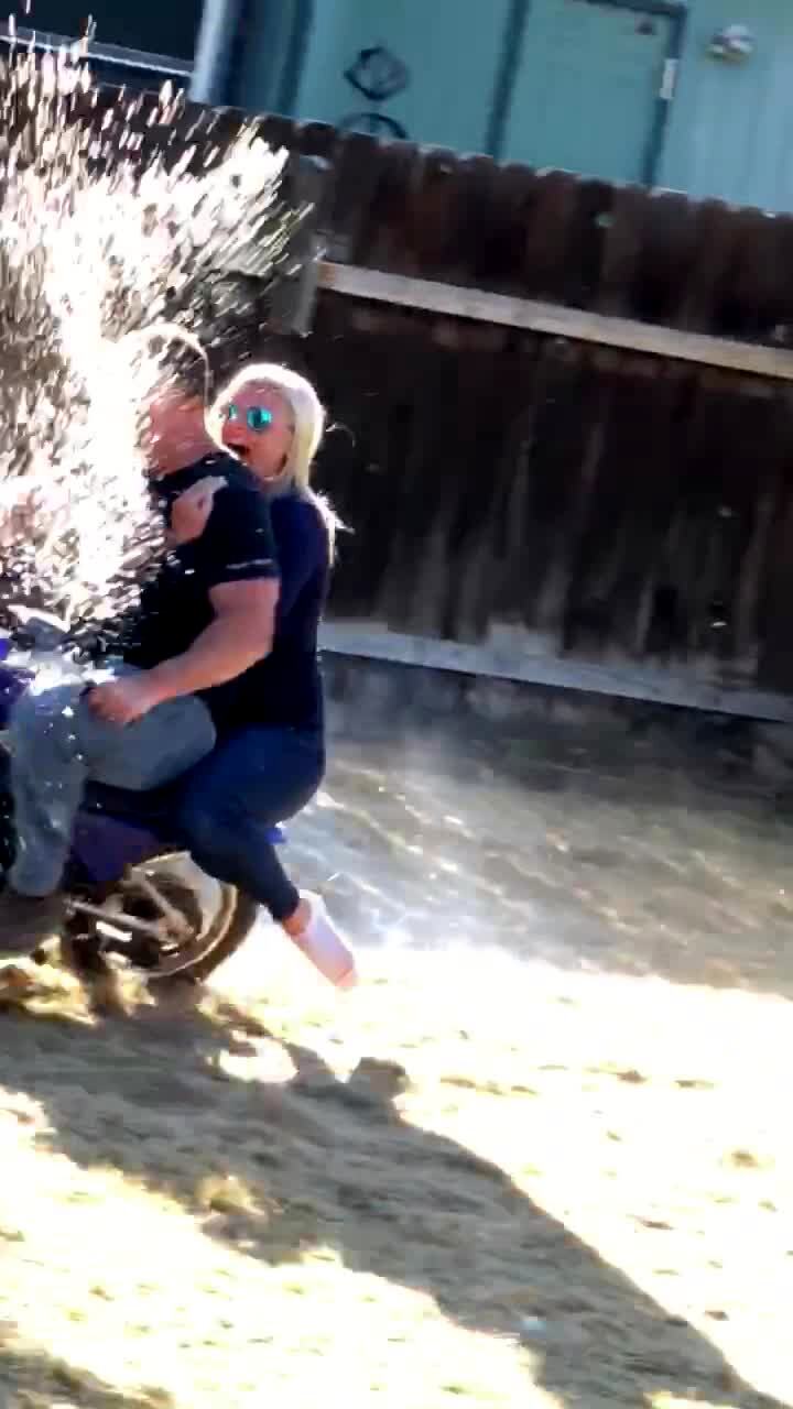 A woman rides a dirt bike in the yard and crashes into a bush. No audio