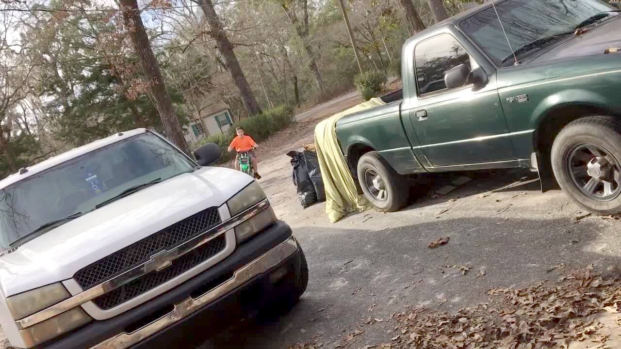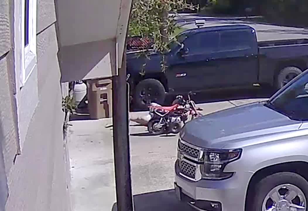 A man falls off a dirt-bike and holds onto the handlebars as it spins in circles around him as he lays on the ground in a front yard. Short head. Home security camera video, no audio.