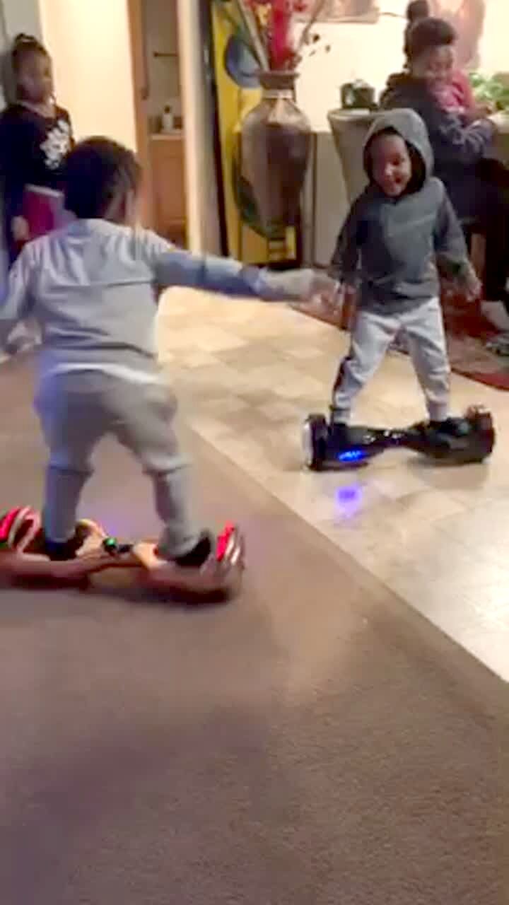 Two young boys ride hoverboards in the living room and bump into each other face first, but neither falls down.