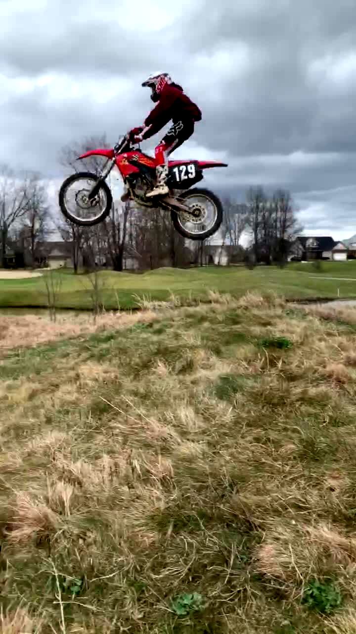 A teen boy rides a dirt bike over a jump in a yard and flies into the air and comes off the bike and falls and lands hard on the ground. The woman with the camera says she could have done better.