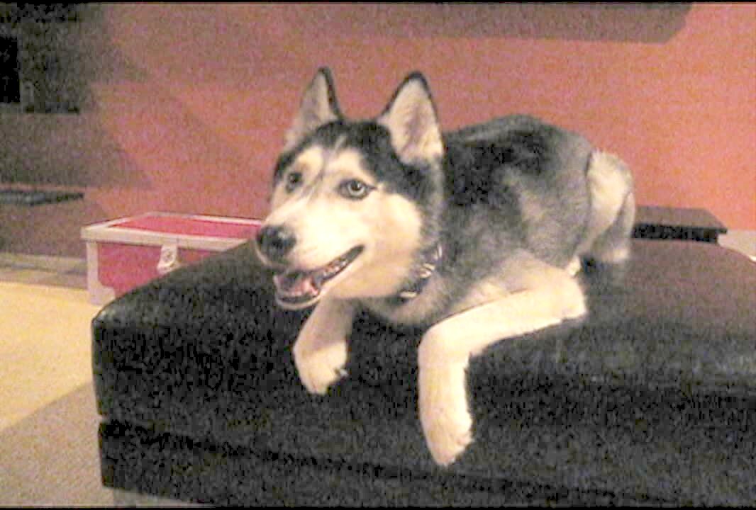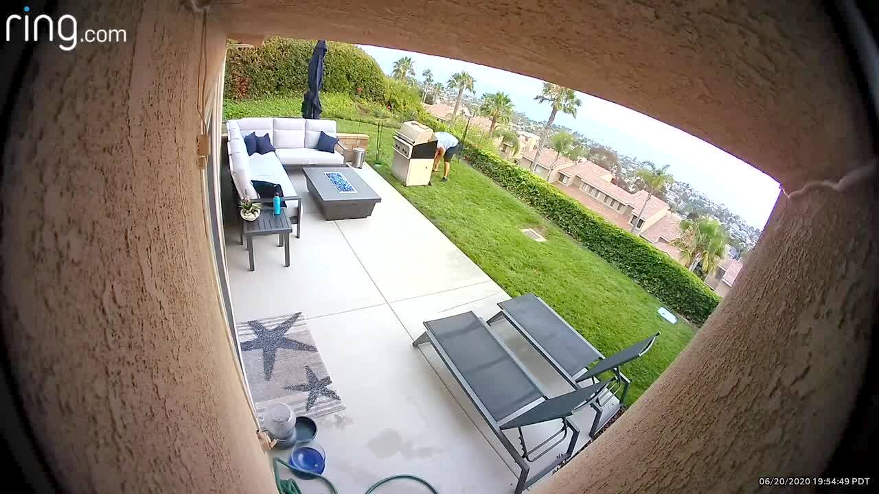 A puppy dog runs full speed into a glass door on a porch. Security footage.