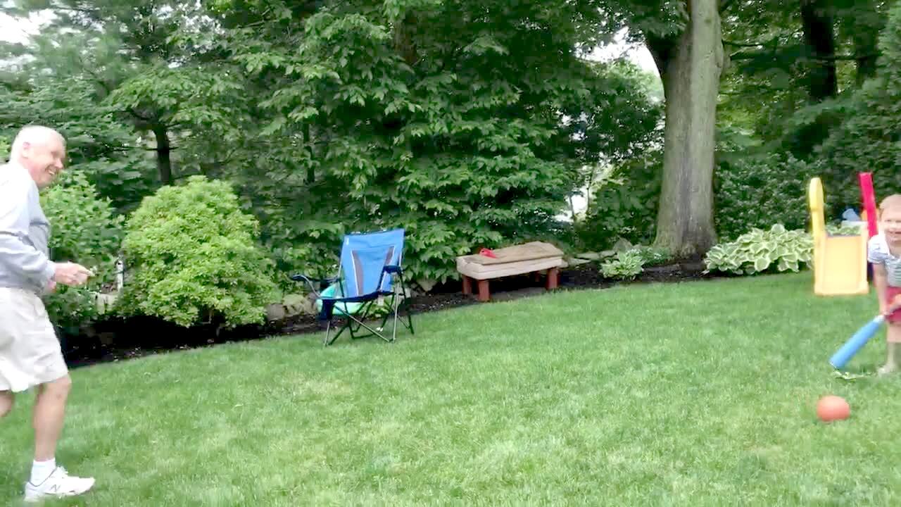 A rooster bird bites at a young girl's ankles, then it chases her around a yard until a dog tackles the rooster. No sound. Security camera footage. Multiple angles.