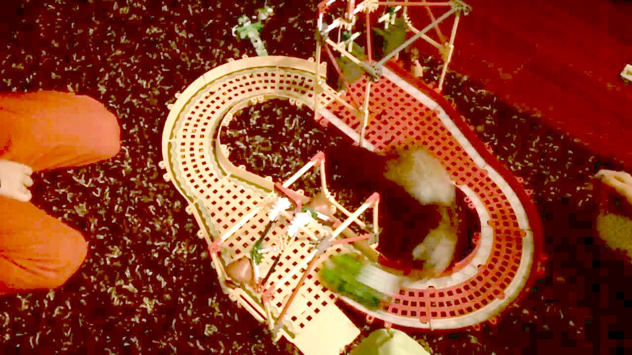 A ferret chases a toy racecar on a small race track while kids laugh and watch in a dark room.